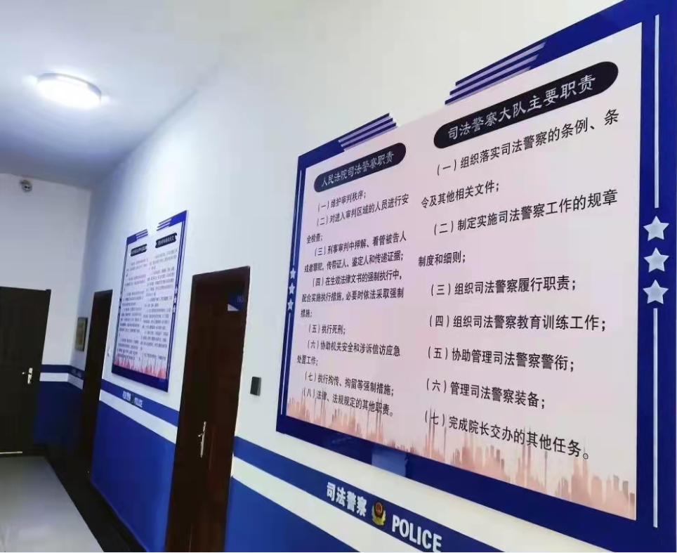 法官風采、警隊建設、廉政文化、干警作品、訴訟文化等內(nèi)容。一樓大廳展示法官墻,為全院法官拍攝統(tǒng)一形象照片,用透明材質(zhì)將全部法官照片全部上墻,突出司法透明這一理念;走廊建設司法警察文化長廊,集中展示司法警察誓詞、警隊風采、警隊人員與值班情況,以及警隊制度等內(nèi)容;在立案庭懸掛立案流程和網(wǎng)上立案流程圖版,方便當事人了解訴訟流程。