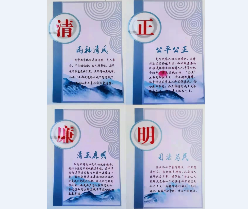 二樓計劃展示干警的文化作品,主要以書法、繪畫、詩詞等為主,目前正在收集當中。三樓打造了廉政文化長廊,集中展示法官法第五條對法官清正廉明的要求,營造風清氣正的濃厚氛圍,提高法官拒腐防變能力,打造了閱覽室,新進了法律、人事、財務、宣傳、紀檢等方面的工具書300余冊,為法院干警學習提供場地,改善干警學習環(huán)境,全力推進“書香法院”建設。